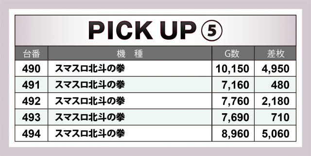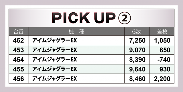 21台中10台と全体の半数弱が勝利を収め、その10台の中では全体の8割となる8台が4桁プラスに終わった。また+8千枚超と+5千枚超が1台ずつ、+4千枚超は2台となった。