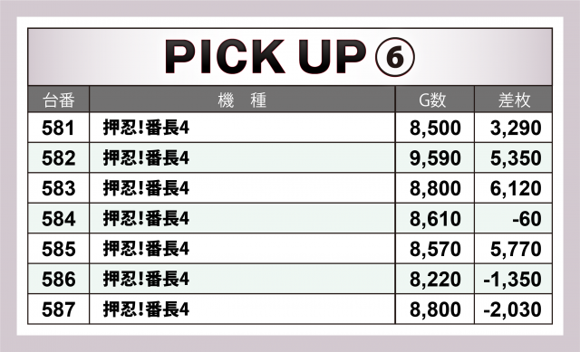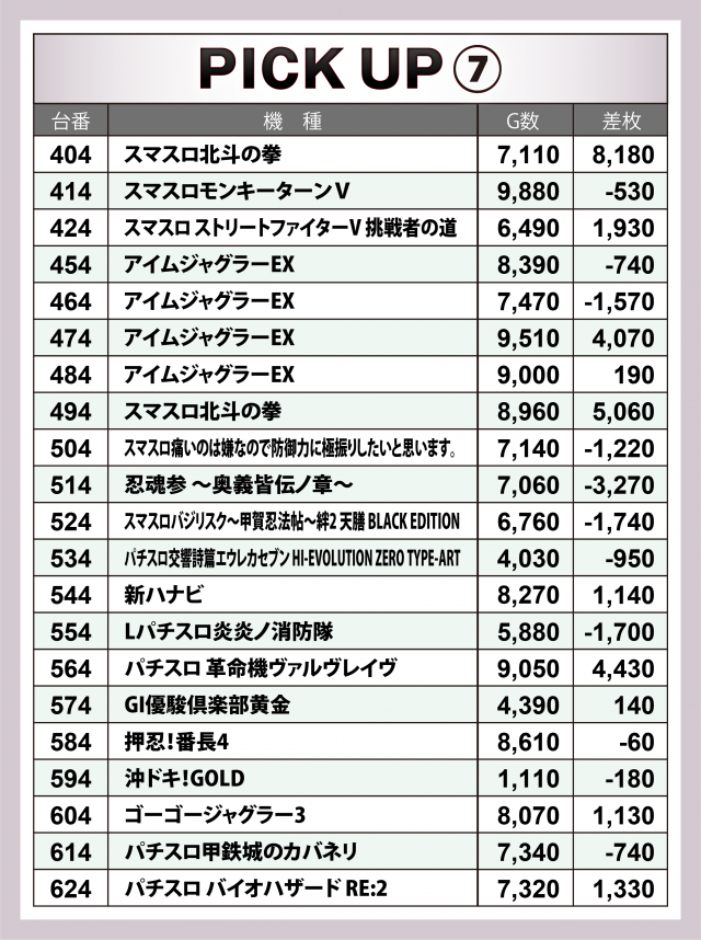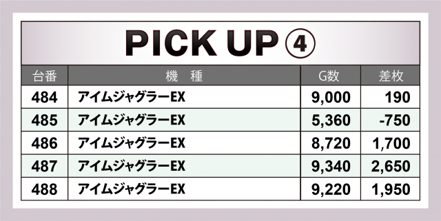 この日の好調台を丹念に調べたところ、番号末尾「4」の台にハイスコアが散見された。各台の差枚数をまとめたのが以下の表だ。