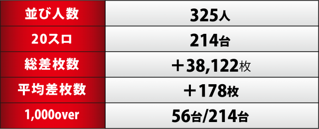 300人超のファンが開店に期待を寄せる中、今回の20スロ214台の合計は…前回の結果に+4千枚上乗せした+3万8千枚オーバーによる快勝で連勝に成功、最高額を更新した。