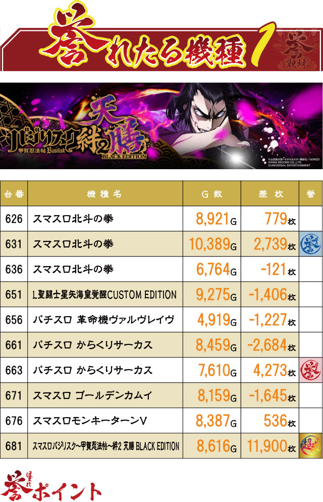 『スマスロバジリスク~甲賀忍法帖~絆2 天膳 BLACK EDITION』の681番台が荒ぶるレコードを叩き出すことに成功。また『パチスロ からくりサーカス』からも+4,000枚超え記録が生まれていた!それにしても…末尾①の台が半数を占めているのは偶然…?