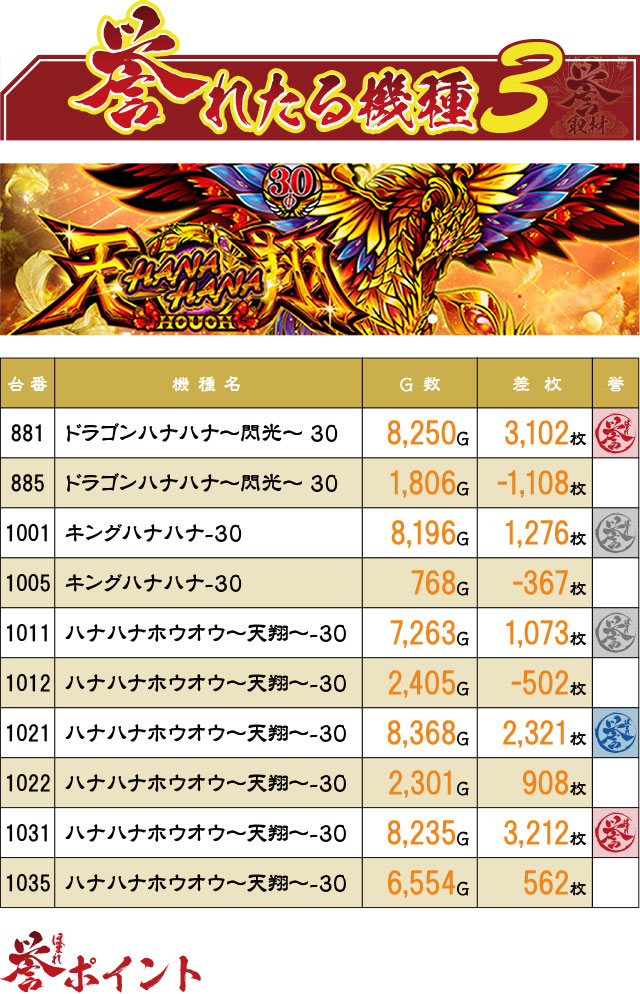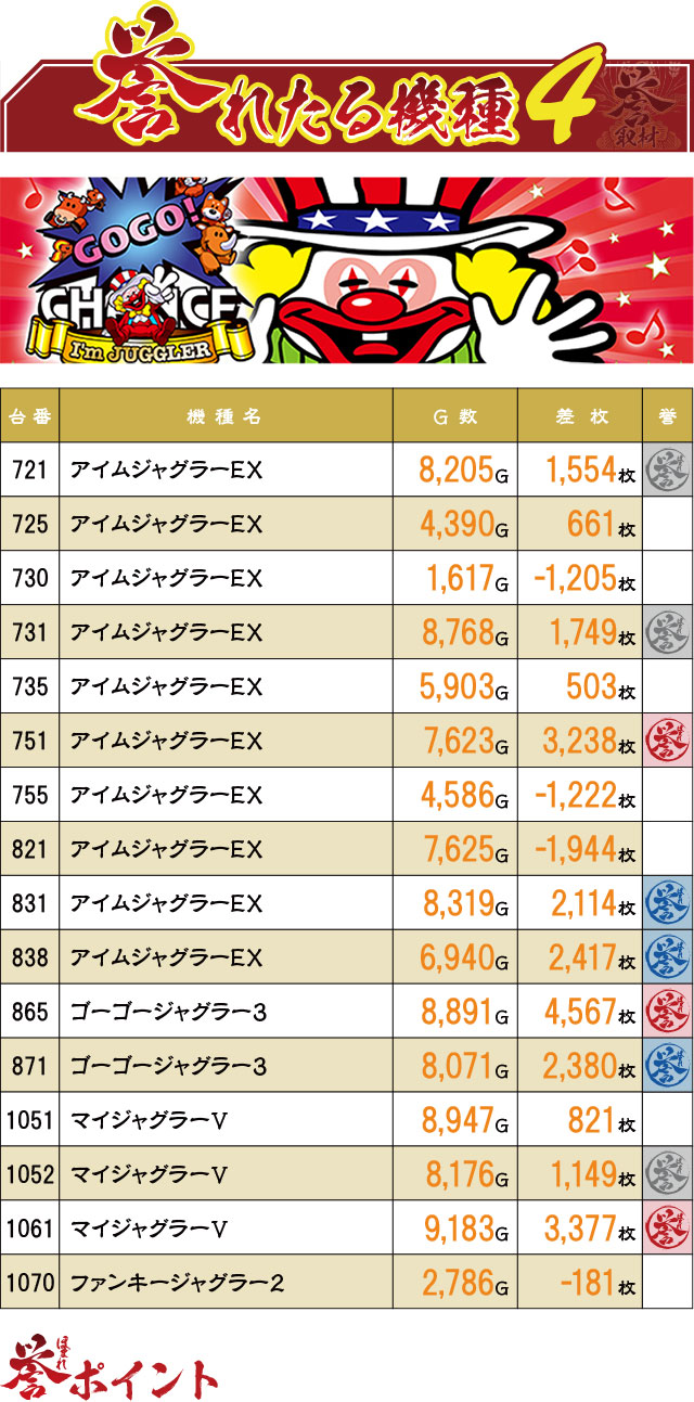 『ハナ』に負けじと『ジャグラー』シリーズも大健闘!数多くの誉マークを目撃することとなった。+3,000枚超えを意味する赤誉マークも出現しており、その数に比例して優秀台も多く潜んでいたのが窺える内容となっていた。