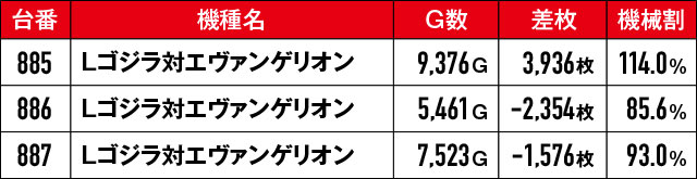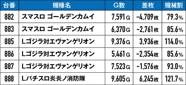 6台が並んだこちらのブロック、残念ながら半数以上の台がマイナスになってしまったものの、885番台&888番台が優秀台の意地を見せ、好レコードを生み出すことに成功!