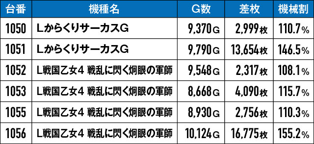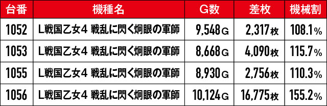 結果だけを見ればこの日の『L戦国乙女4 戦乱に閃く炯眼の軍師』は全台系だったとしか思えない。むしろ全台系じゃないのにこんな結果になる確率は天文学的な数値かと。