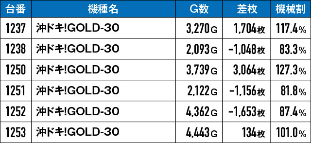 『沖ドキ!GOLD-30』が6台並んだこちらのブロック。勝率は50%と控えめではあるものの、各台の挙動から優秀台の6台並びの可能性は十分!