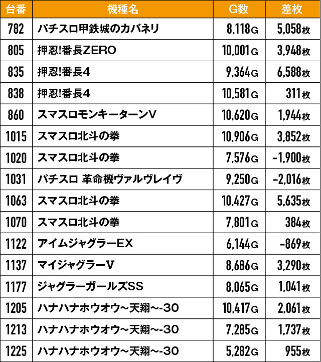 6台並んで6台ともが+2,300枚オーバーという衝撃的な結果!しかもこの6台の中には+13,000枚オーバー台が2台も!これは優秀台の6台並びと見て間違いなさそう。