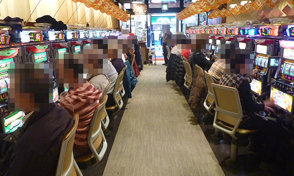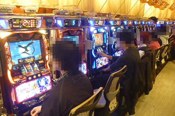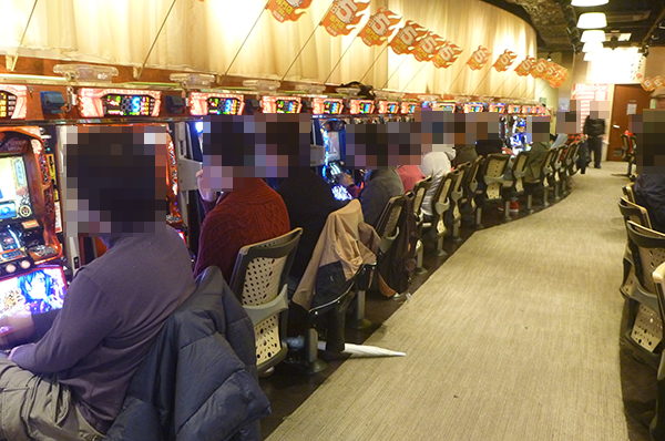 開店直後のホール内をみると、「バジリスク~甲賀忍法帖~絆」や「SLOT魔法少女まどか☆マギカ」など、多数の機種が満席。