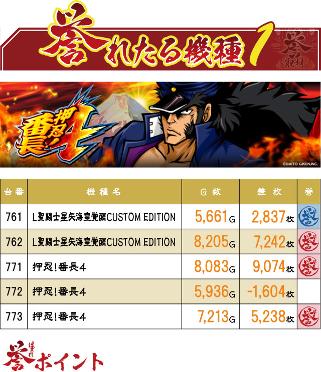 2台並び・3台並びで好結果となっているゾーンを見かけたこの日。『押忍!番長4』の771~773番台の3台並びは、772番台がマイナスに陥ってしまったが、決して悪い挙動ではなかった。
