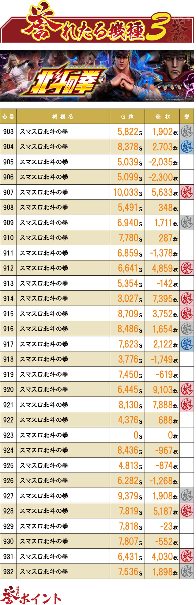 『スマスロ北斗の拳』30台の結果を集計したところ、半数の15台に誉マークが付くほどの優秀な状況だった。さらに誉マークの内の半数が赤誉マーク。最低でも2台に1台以上は優秀台が潜んでいたのではないだろうか。
