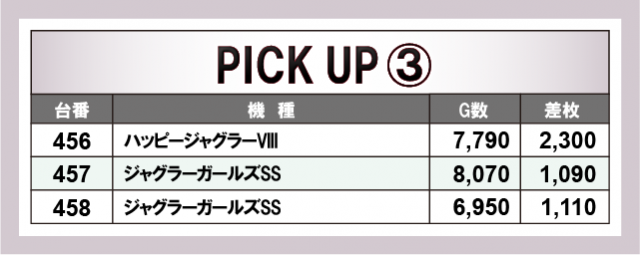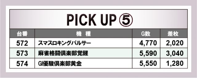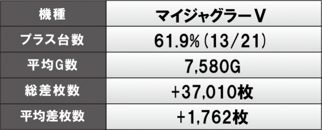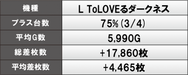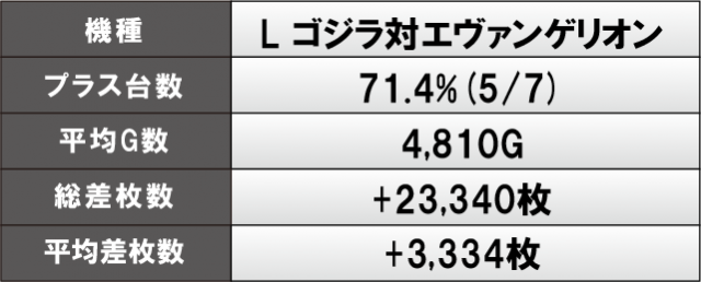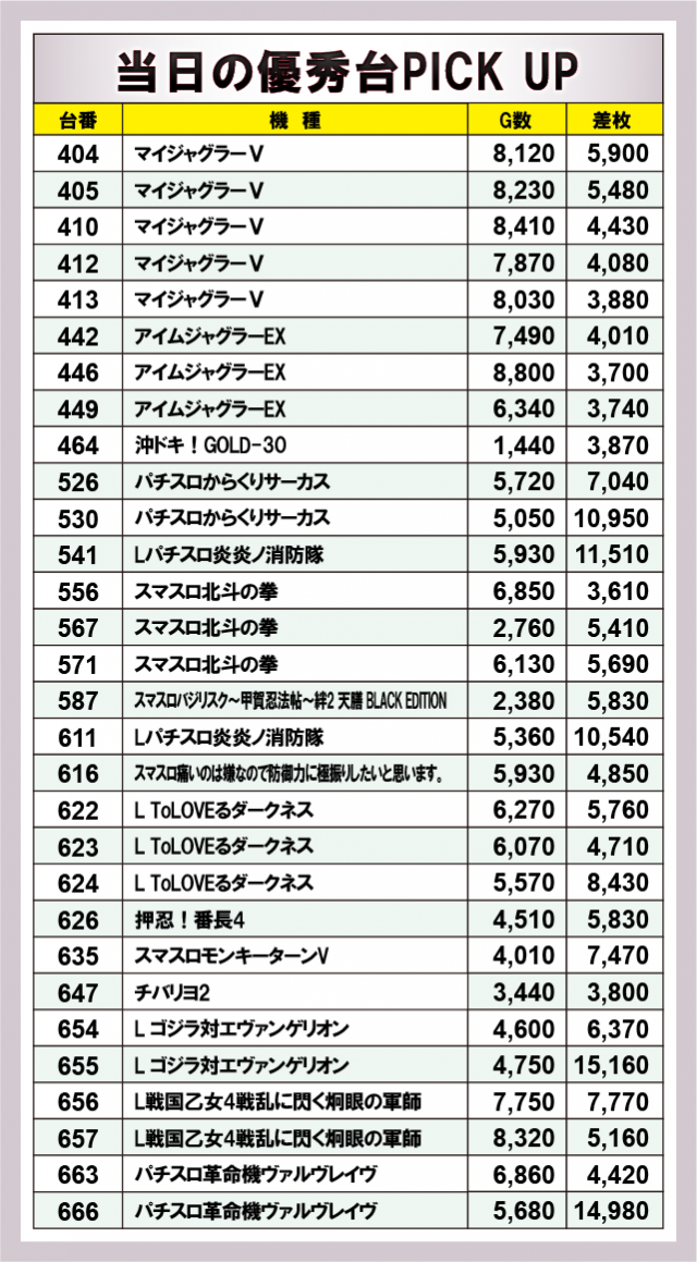 前述したように『L ゴジラ対エヴァンゲリオン』『Lパチスロ炎炎ノ消防隊』からは、万枚オーバーという凄まじい熱が放たれていた。さらに『L ToLOVEるダークネス』も平均差枚数+4,000枚オーバーの好記録をマークし、新台もさっそく大活躍していた。また、『マイジャグラーⅤ』では、総差枚数+37,010枚という数字から、コンスタントにボーナス当選を果たしており、GOGOランプが絶えず輝いていたに違いないだろう。