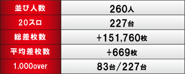 優秀台をチェックしてみると、『L ゴジラ対エヴァンゲリオン』655番台+15,160枚を筆頭に、『パチスロ革命機ヴァルヴレイヴ』666番台+14,980枚、『パチスロからくりサーカス』530番台+10,950枚、『Lパチスロ炎炎ノ消防隊』で万枚オーバーが2台など、トータル5台の万枚オーバーという圧巻の記録を打ち立てた。