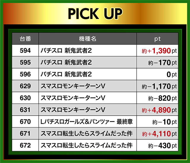 670番台から672番台の並びでは、『スマスロ転生したらスライムだった件』の671番台が約+4,100ptを上回った。