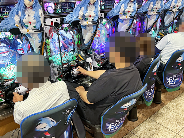 15時ごろの4円パチンコでは「P大海物語5」や「ぱちんこ シン・エヴァンゲリオン Type レイ」の盛り上がりが大きい。活気あるシーンを至る所で目にしている。