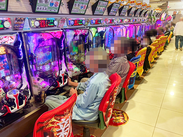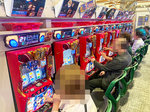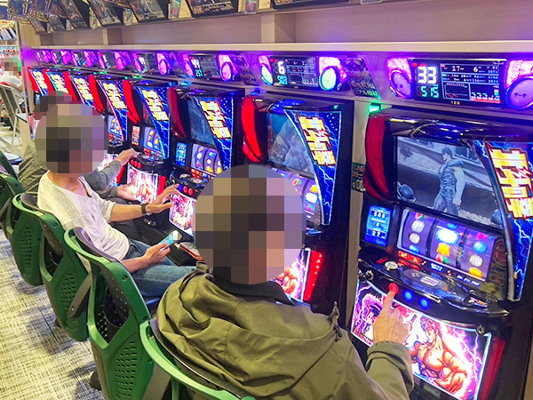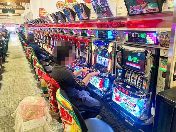 取材時は多くのプレイヤーが来店。パチンコ・パチスロともに、様々な機種が支持を得ていた。