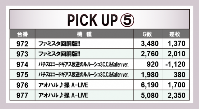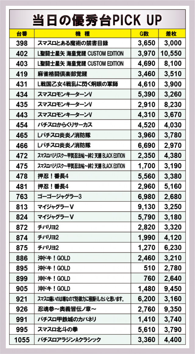 差枚数で大きな数字を打ち立てたのが、当日の新台入替で導入されたばかりの『L聖闘士星矢 海皇覚醒 CUSTOM EDITION』402番台+10,550枚だ。これに続いて『沖ドキ!GOLD』905番台+9,450枚、『忍魂参~奥義皆伝ノ章~』926番台+9,350枚と気を吐く台も確認でき、熱量の高さを窺うことができる。