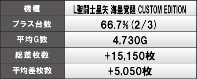 『L聖闘士星矢 海皇覚醒 CUSTOM EDITION』で平均差枚+5,050枚を記録し、新台もさっそく大活躍した1日に。また『チバリヨ2』でも平均差枚+2,212枚をマークし、いずれもポテンシャルには感服するばかりだ。