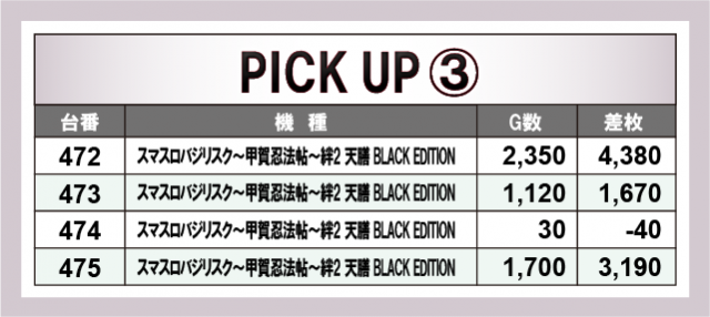 『スマスロモンキーターンV』『パチスロからくりサーカス』『スマスロバジリスク~甲賀忍法帖~絆2 天膳 BLACK EDITION』『スマスロ痛いのは嫌なので防御力に極振りしたいと思います。』『アオハル♪操 A-LIVE』など、人気機種や最新台で横並びの好況スポットを形成。全台がプラス差枚とはいかなかったものの、明らかな好感触にファンは口角を緩めていたはずだ。