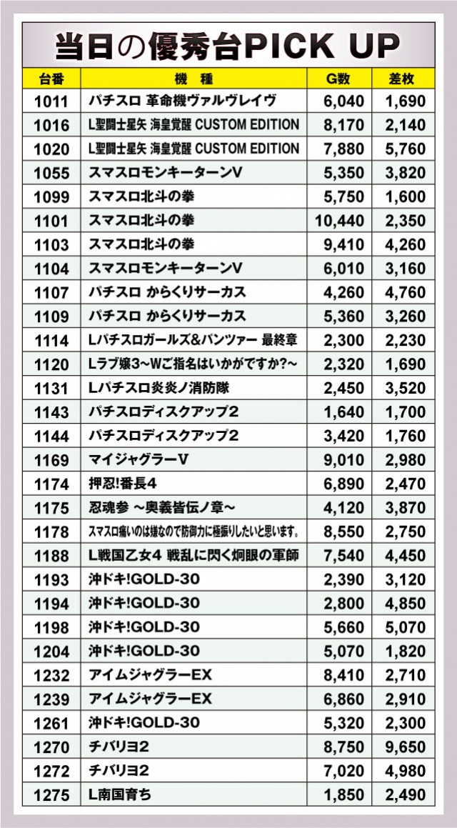 それ以外でも人気機種中心の優秀台の面々となっており、『星矢』『北斗』『からくりサーカス』などのAT機から『ディスク』『アイムジャグラー』などのノーマルタイプまで幅広かった。