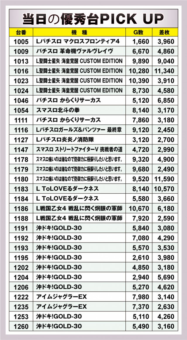 今回の傾向としては当店の人気看板機種である『沖ドキ!』と新機種のスマスロに多数の優秀台が見られた。今後の「英雄のリアル」実施時のために何番台からどれだけの差枚数が出たのかしっかりとチェックしておこう。