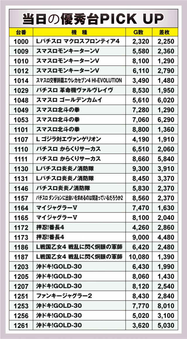 『ビックつばめ小名浜西店』の定番機種というとやはり『沖ドキ!GOLD-30』! 前回もそれなりの優秀台の台数であったが、今回は当企画のメインを張る6台もの優秀台が飛び出している。