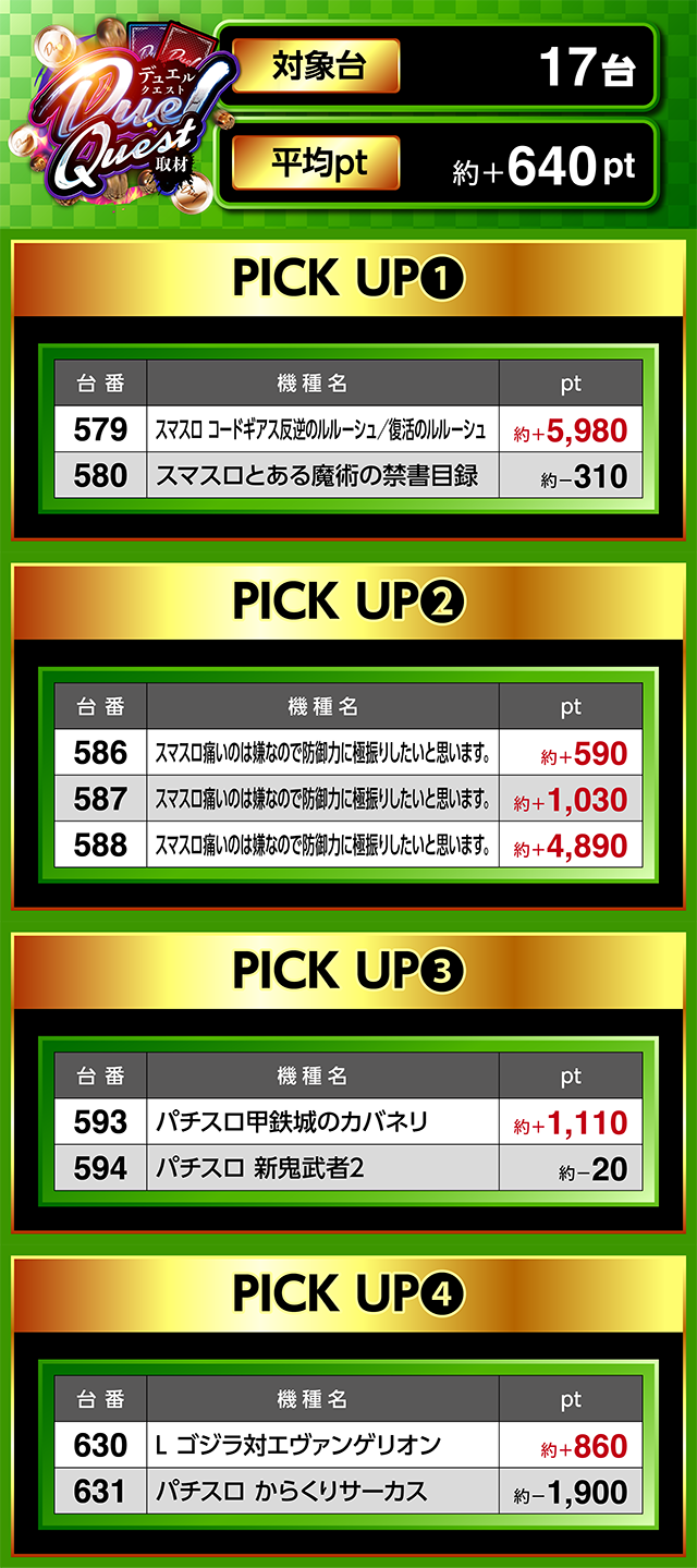 579番台と580番番台の並びでは、579番台の「スマスロ コードギアス反逆のルルーシュ/復活のルルーシュ」が約+5,980ptを記録した。
