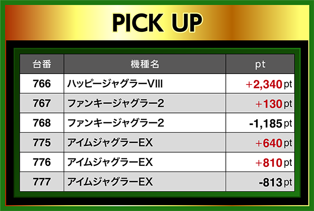 766番台から768番台までの並びでは、766番台の『ハッピージャグラーVⅢ』が+2,300ptオーバー。