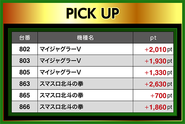 『スマスロ北斗の拳』にも3台連続でプラスとなる場所があり、863番台は+2,600ptを上回った。