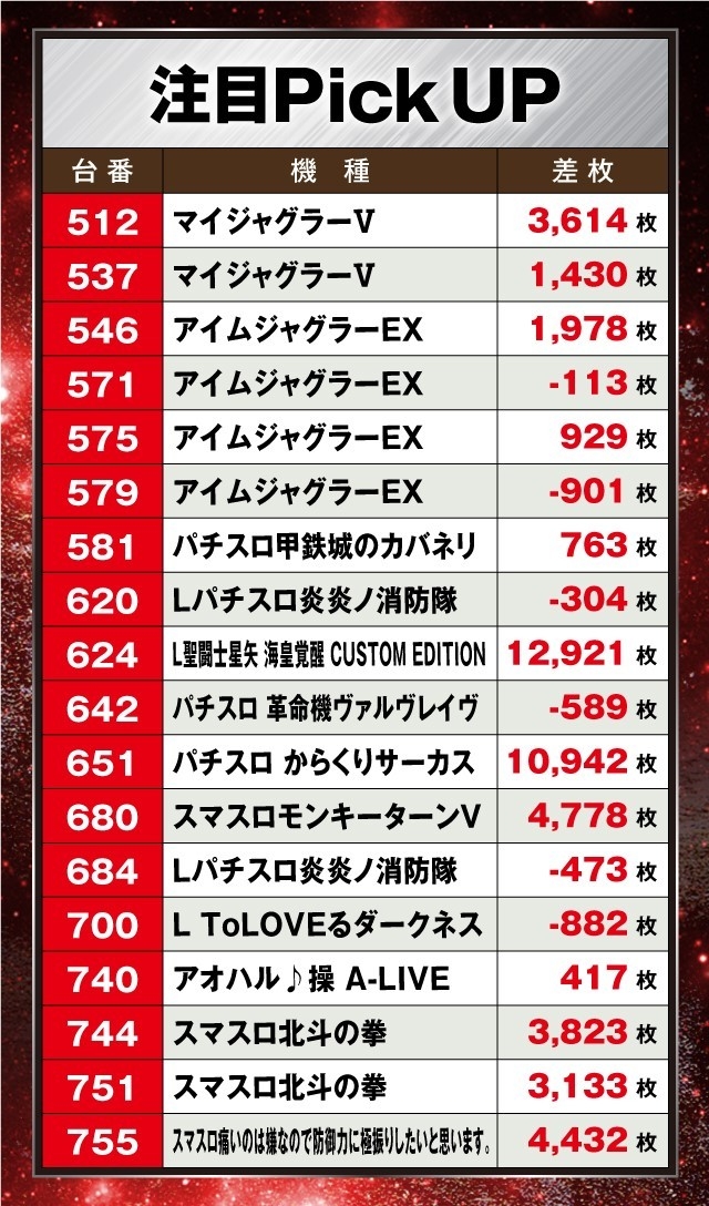 全部で18台あった好調台の内12台がプラス。万枚超えが2台あったこともあり、全台平均が+2,550枚と非常に高いアベレージを記録していた。
