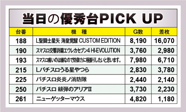 『L聖闘士星矢 海皇覚醒 CUSTOM EDITION』188番台+16,070枚という結果が鮮烈で、万枚OVERという凄まじい熱気が店内に伝播していたようだ。『スマスロ痛いのは嫌なので防御力に極振りしたいと思います。』193番台+6,710枚という大台突破台もあり、盛り上がりに満ちた1日になったと言える。