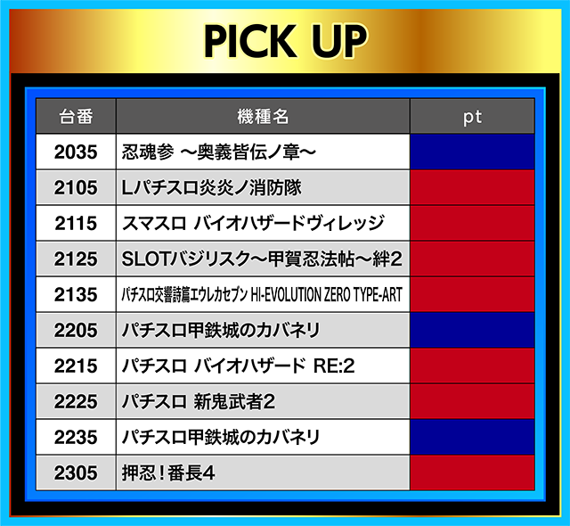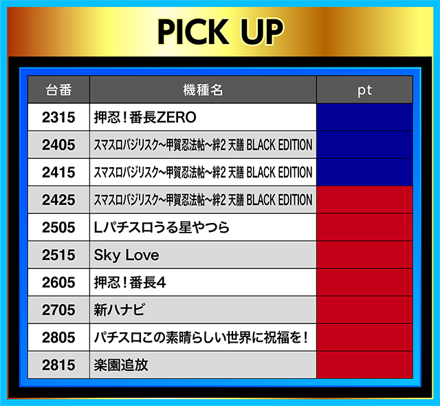 ほかにも、『パチスロ交響詩篇エウレカセブン HI-EVOLUTION ZERO TYPE-ART』の2135番台や『スマスロバジリスク~甲賀忍法帖~絆2 天膳 BLACK EDITION』の2425番台などが結果を残した。