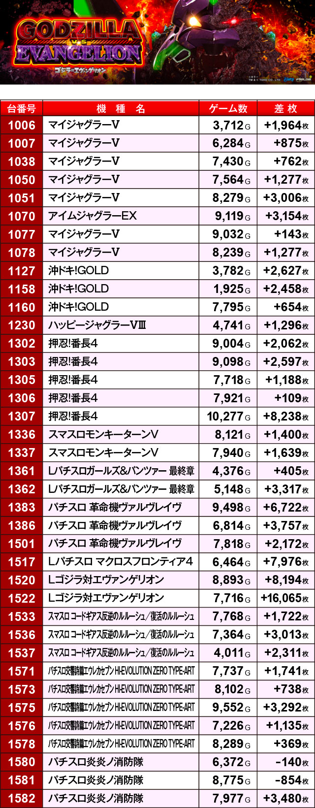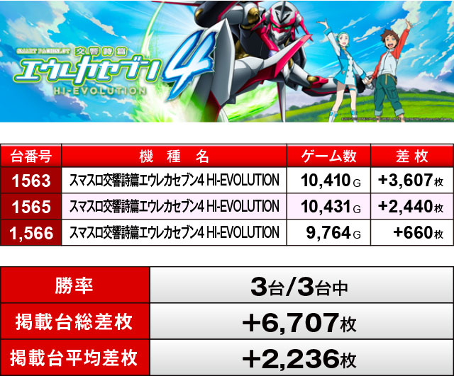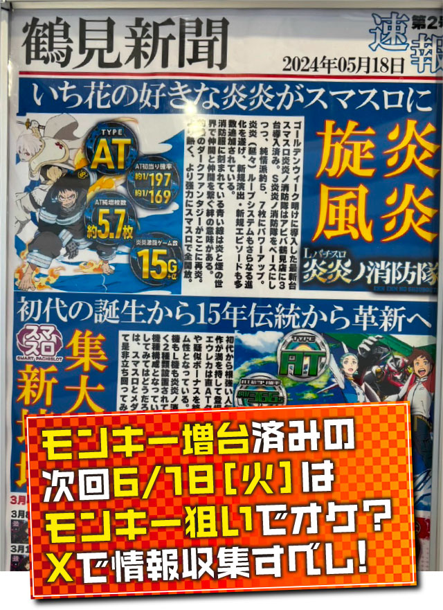 この日の鶴見新聞には『パチスロ炎炎ノ消防隊』と『パチスロ交響詩篇エウレカセブン HI-EVOLUTION ZERO TYPE-ART』のことが書かれていたが、この2機種が並びでしっかり結果を残してくれた。また他の機種にも目を向けてみると、いずれも並びで好結果を生み出している台が少なくなく、このあたりが今後の立ち回りの肝となるかもしれない。
