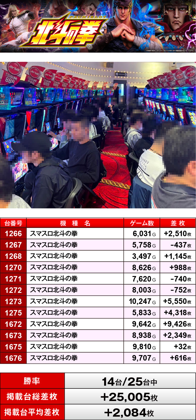 『スマスロ北斗の拳』コーナーでは、8台並びと4台並びが出現!そのほとんどをプラス台が占め、1275番台が4,000枚オーバー、1273番台が5,500枚オーバー、極めつけは1672番台の9,000枚オーバー記録!『北斗』と『からくり』には毎回優秀台ムーブの台があるのは…気のせい?