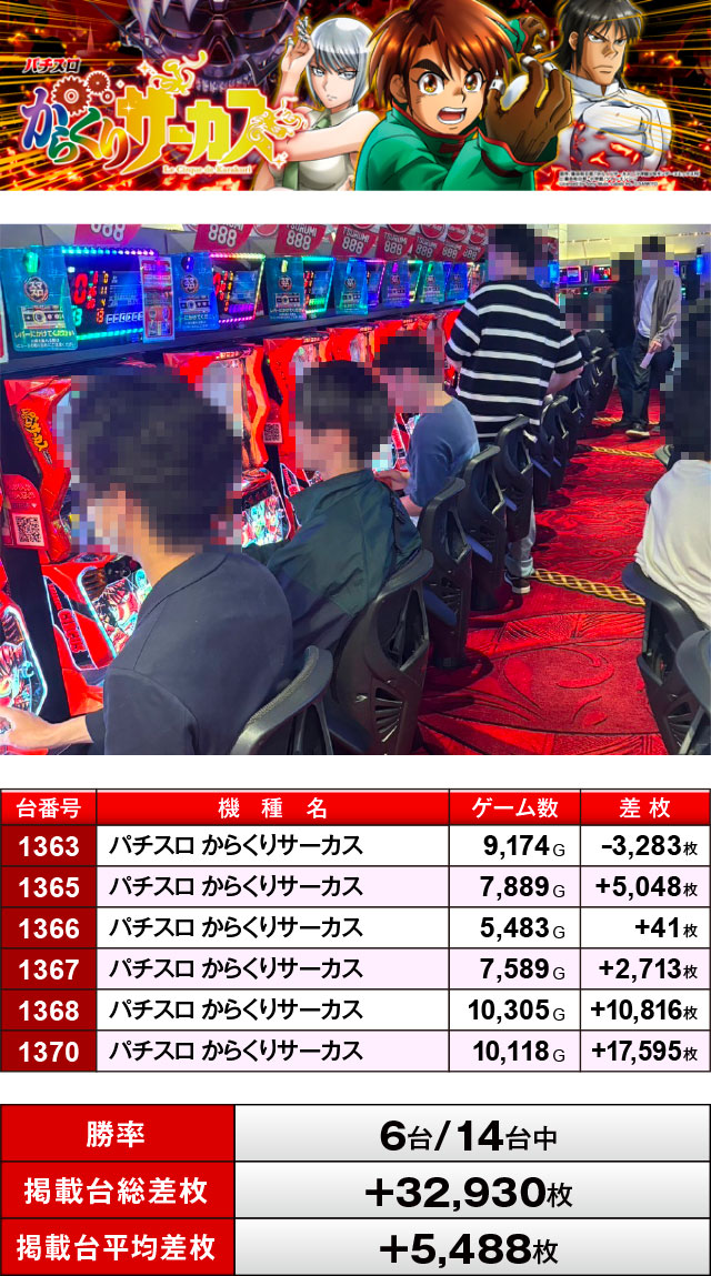 6台並んで優秀台挙動を披露してくれたのは、『パチスロ からくりサーカス』。この6台の勝率の高さもさることながら、2台並んで10,000枚オーバーを達成!おかげで1365番台の5,000枚超えレコードが霞んでしまった…。