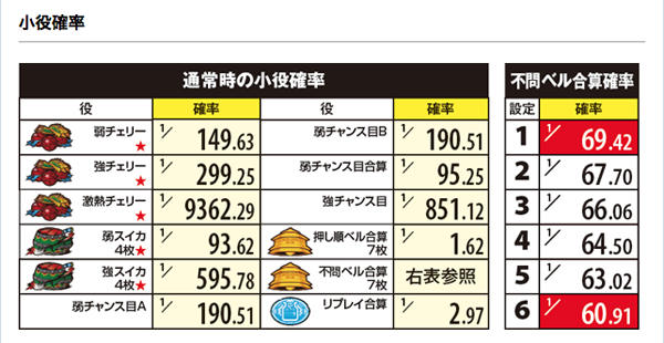 小役確率に設定差が設けられているのは不問ベルの確率。通常時からボーナス中まで、しっかりとカウントし、サンプル数を増やして設定推測に活用したい。