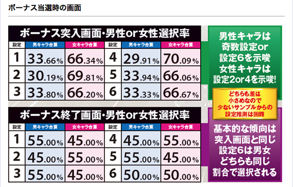 ボーナス当選時の画面も要チェック。男性キャラは奇数設定or設定6、女性キャラは設定2or4設定において出現率が高い。