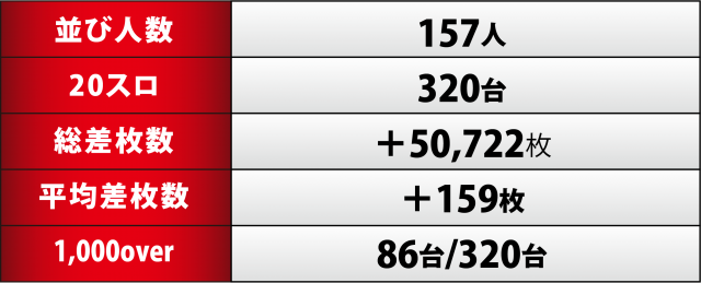 前述した通り、この日の[1000円/46枚]スロ全320台のトータルは+50,722枚とハイレベルな出玉を叩き出した。