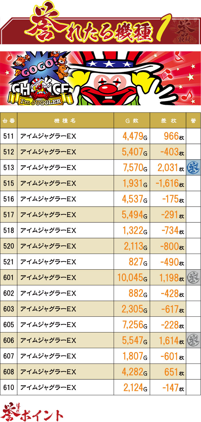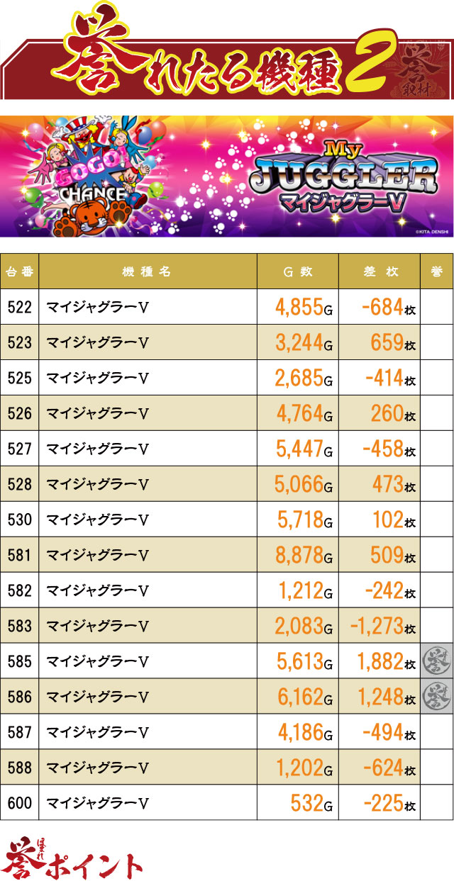 15台設置の『マイジャグラーⅤ』のトータル差枚はプラス域に。しかし+3,000枚を上回る結果がなかったのが残念…。次回は『ジャグ』らしからぬ猛レコードで格の違いを見せつけてくれるはず!