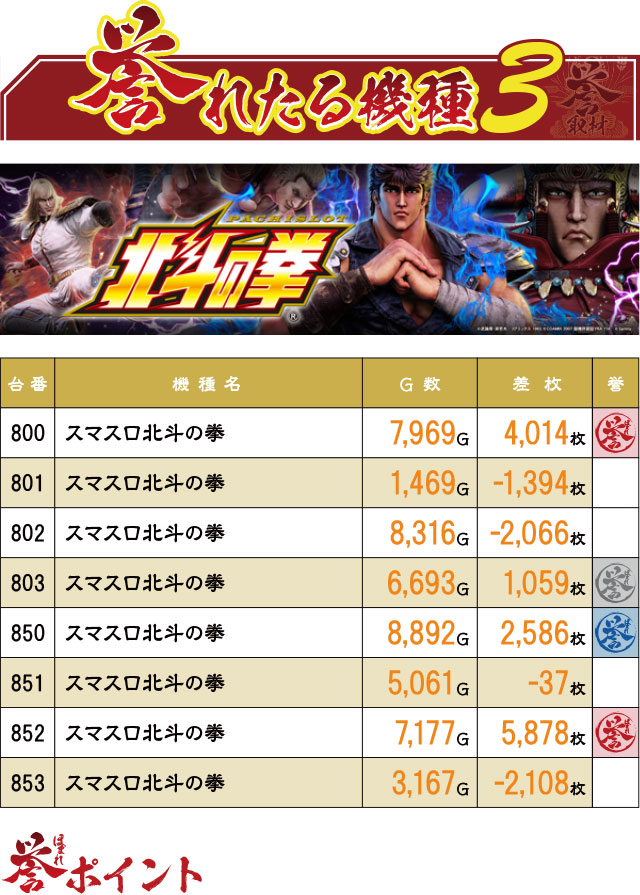 8台設置の『スマスロ北斗の拳』もトータル差枚は当然プラス!特筆すべきは優秀台挙動を出しまくり、+4,000枚超え&+5,500枚超えを果たした800&852番台の快進撃だろう。