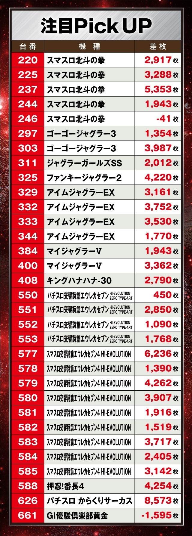 また、その他の機種も負けておらず『パチスロ からくりサーカス』で+8,573枚、『スマスロ北斗の拳』で+5,353枚、『ファンキージャグラー2』で+4,220枚を記録するなど、全台系以外の機種もかなりの盛り上がりを見せていた。