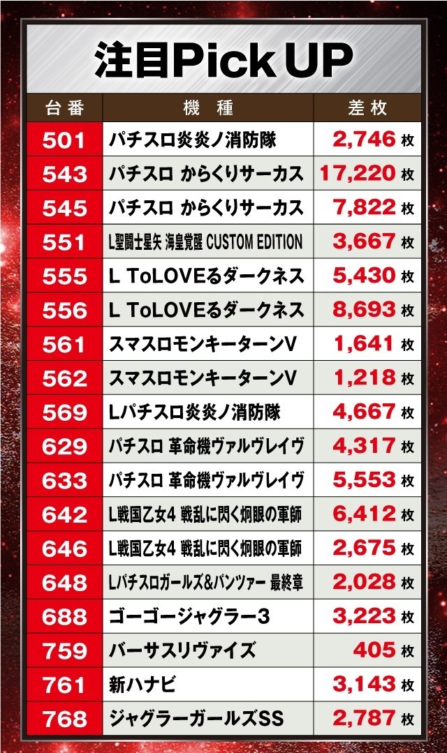 特に目立っていたのが『パチスロ からくりサーカス』で、543番台が万枚突破の+17,220枚、545番台が+7,822枚と大盛り上がりを見せていた。