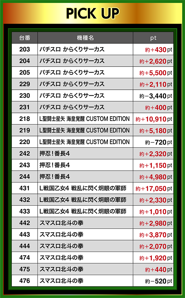 どちらにもプラスが連なる場所があり、約+2,000ptを超えた台も複数あった。