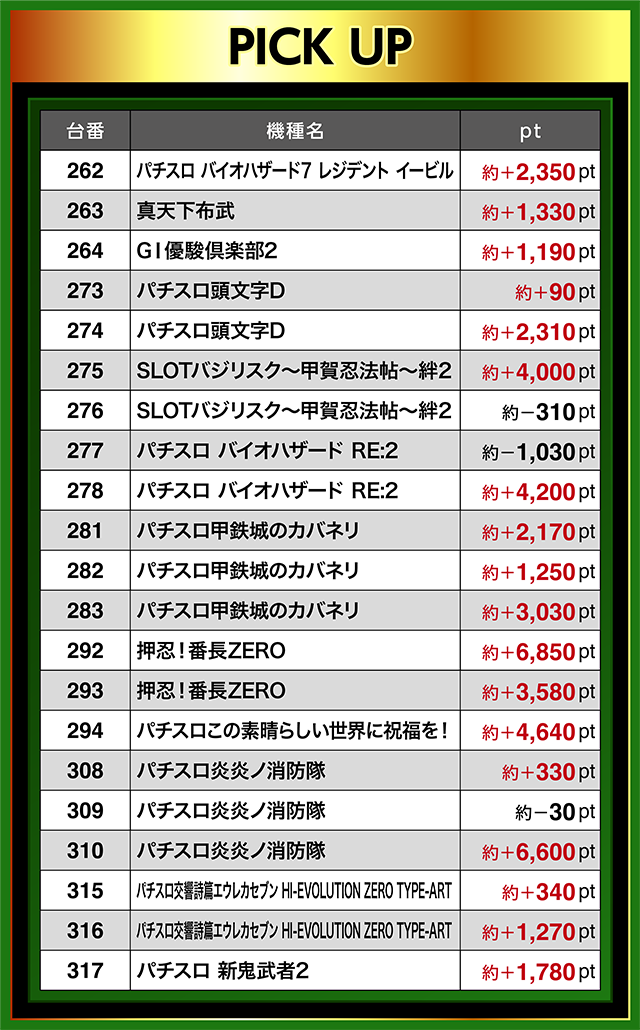 『押忍!番長ZERO』の292番台から『パチスロこの素晴らしい世界に祝福を!』の294番台までには約+3,500pt以上が続き、約+6,800ptを超えた台もあった。
