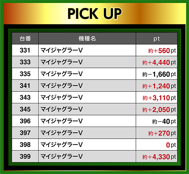 『マイジャグラーⅤ』は333番台が約+4,440pt以上、343番台と345番台は約+2,000pt超。