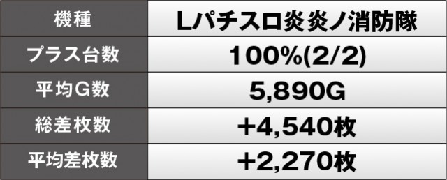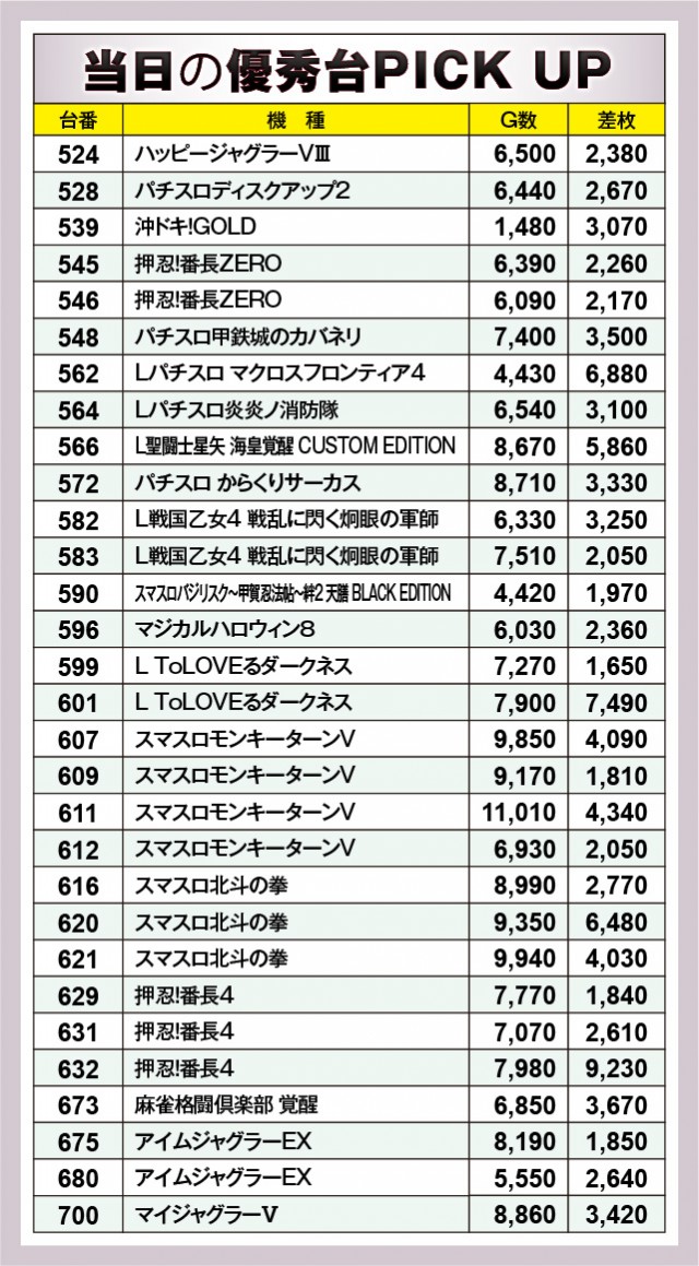 『L ToLOVEるダークネス』『Lパチスロ炎炎ノ消防隊』は勝率100%を記録。『押忍!番長4』『押忍!番長ZERO』も高い勝率を記録し、これら機種が盛り上がりの中心になっていたと言える。特に『L ToLOVEるダークネス』は終日を通して打ち込まれており、相当な手応えを感じた結果、総差枚数+9,590枚と大きなインパクトを残している。