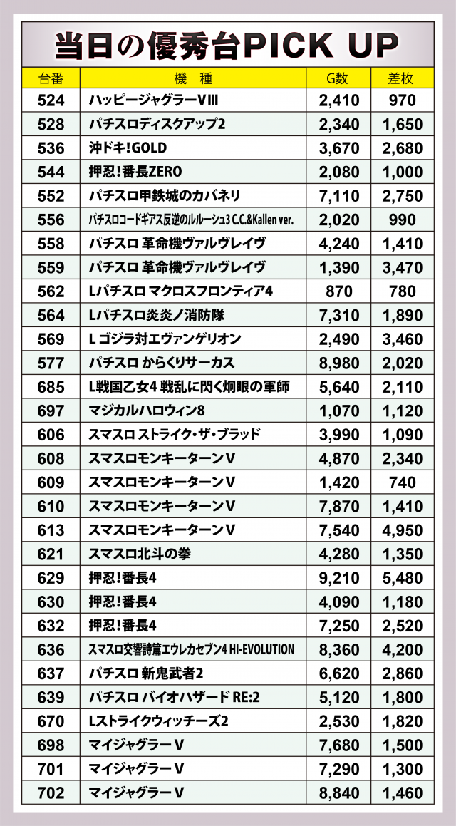 以下、入手した出玉データから当日の優秀台にクローズアップしていこう。