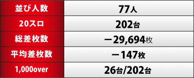 この日、[1000円/46枚]スロ全202台の合算はマイナスに終わり、初の黒星を喫してしまった。