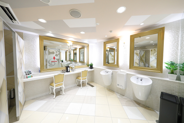 女性用トイレには変わらずゴージャスなパウダースペースが備えつけられ「非日常感」の演出を忘れない。