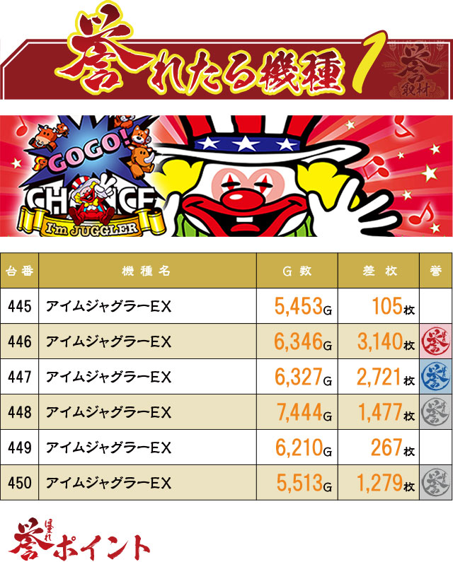 6台並んでプラスという何かしらの仕掛けを予感させる結果を見せた『アイムジャグラーEX』。特に446・447番台は2台並んで+2,500枚超えの好調っぷりを披露してくれた!