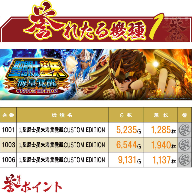 新台の『L聖闘士星矢海皇覚醒CUSTOM EDITION』はややおとなしめな発進。誉マーキングの付いた台はあったものの、欲を言えばもうひと押し欲しかったところ。やはり見たいのは+3,000枚超えを示す赤誉マーキング!