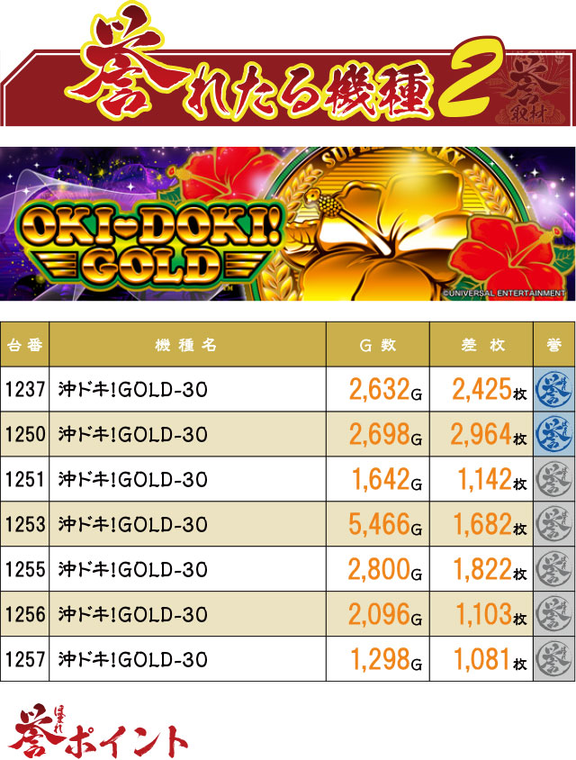 前回(6/3)誉マークの多かった『沖ドキ!GOLD-30』は、この日も多くの誉マークに迎え入れられる結果に。こちらも赤誉マークに出会えなかったのは、総ゲーム数の少ない台があったためだろう。