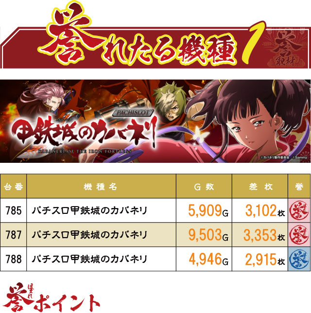 7台中3台に誉マークがついた『パチスロ甲鉄城のカバネリ』。特に785・787番台は危なげなく+3,000枚を突破し、優秀台としての責務をしっかりと果たしてくれた。